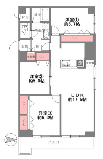 | 間取内容 | LDK17.5帖 洋室5.7帖 洋室5.0帖 洋室6.3帖 | ||
